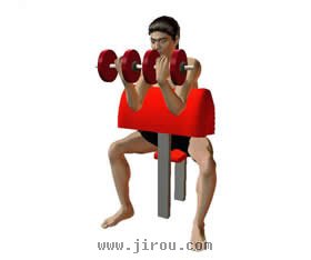 •哑铃用双手在特制板凳上弯举。